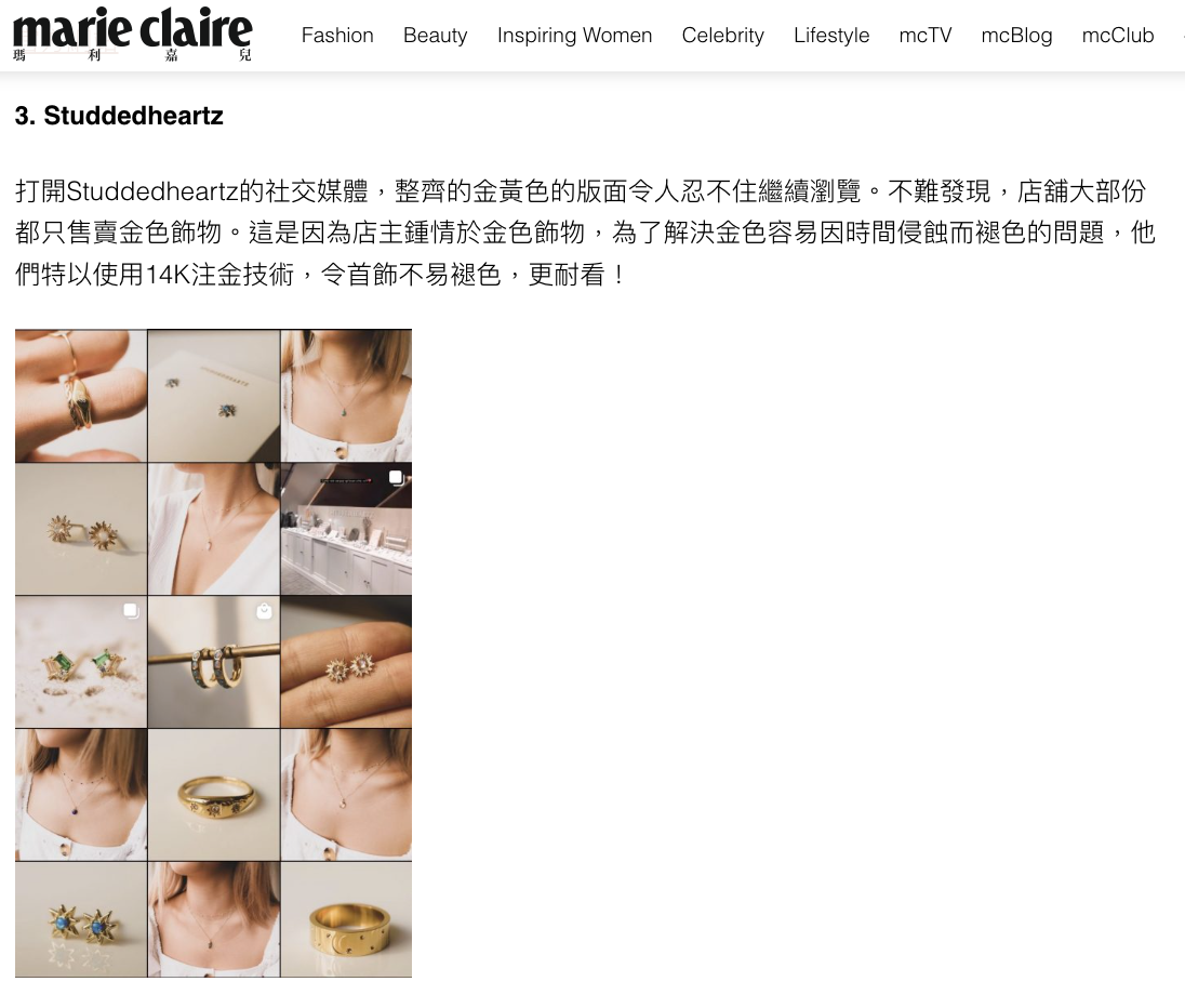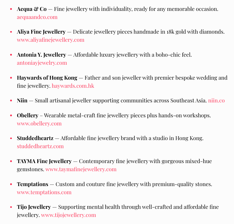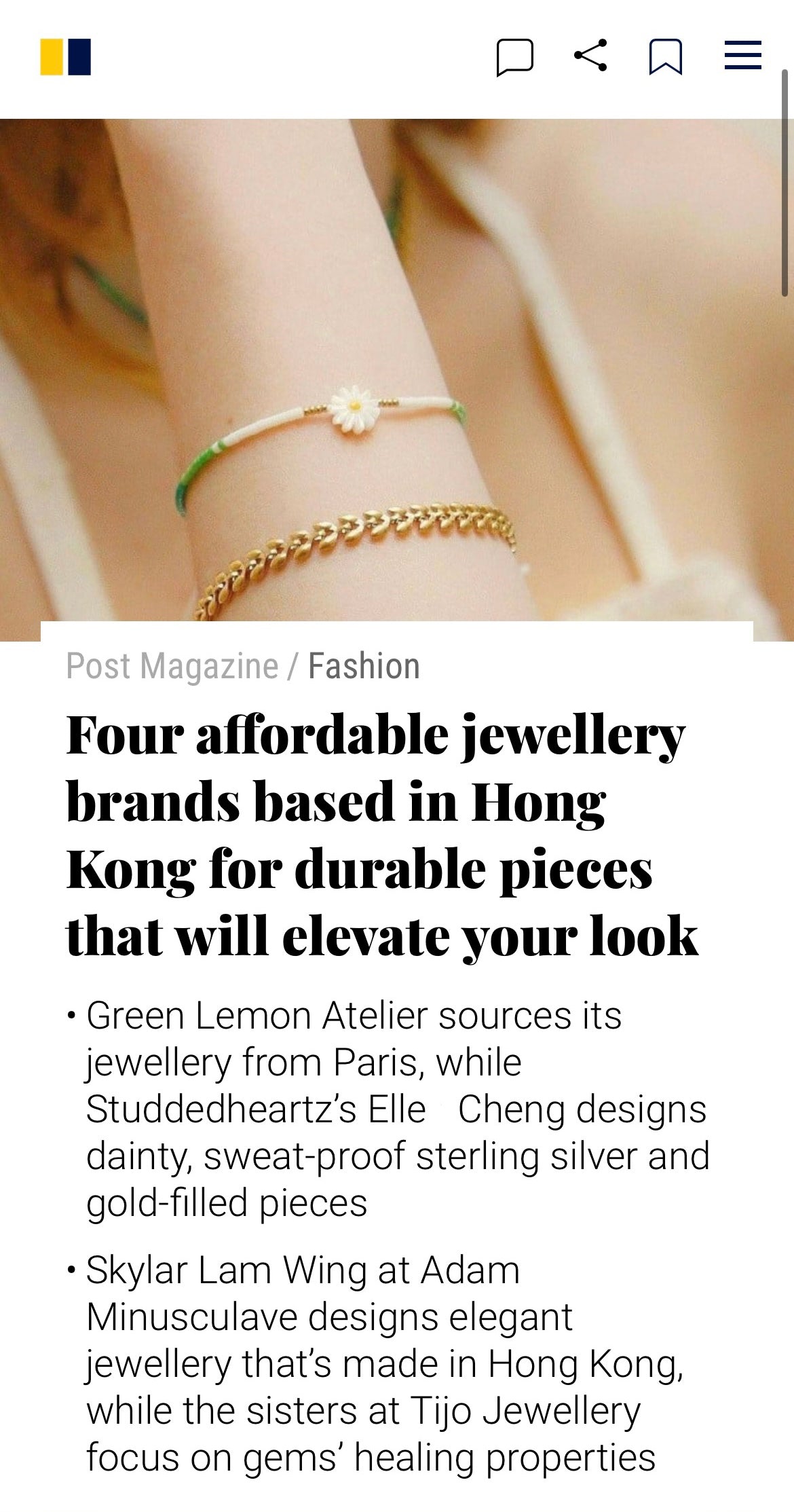 Brand feature on Honeycomber's articel "Shop jewellery in Hong Kong: Unique rings, colourful bracelets and stunning necklaces".